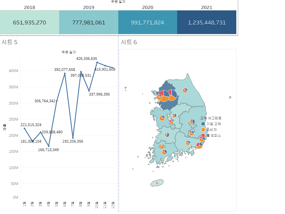 시도별 매출과 고객 세그먼트 비율과 매출로 파이차트를 만들고
