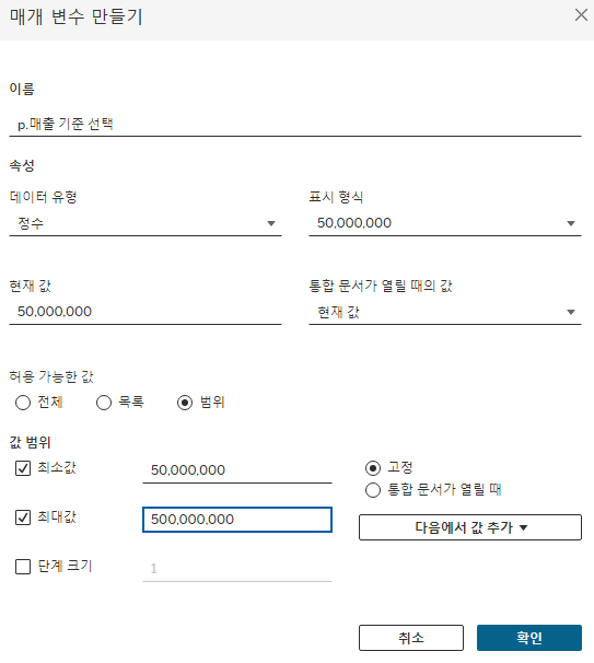 단계 크기는 한번 이동하는 범위인데 5천만으로 설정