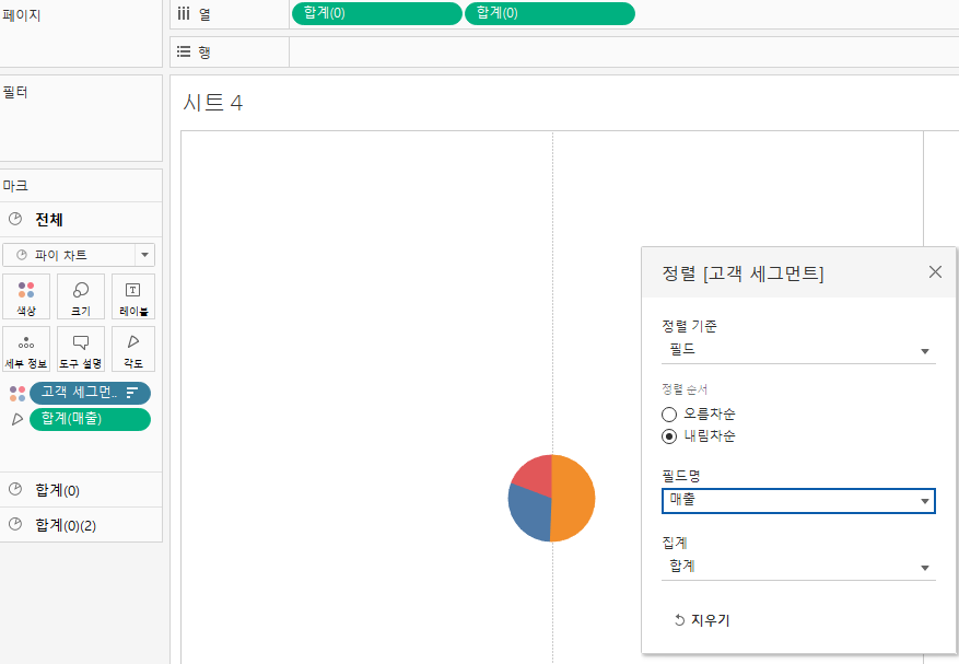 고객 세그먼트와 매출로 파이를 쪼갰는데 이전처럼 내림차순을 할 수 없다.