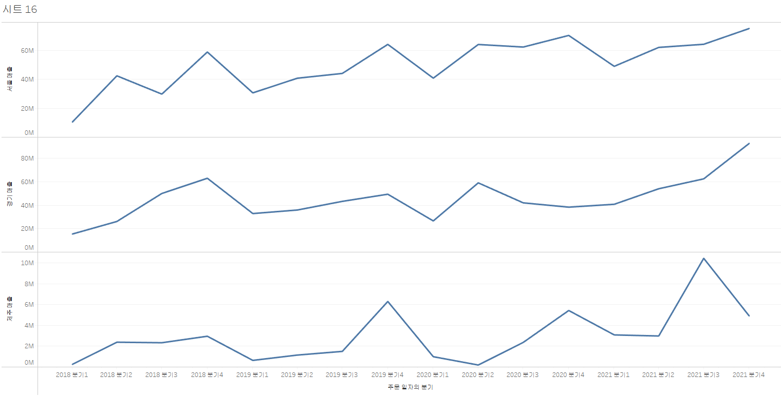 서울시,경기도 그리고 제주도 분기별 매출을 보고 싶다 가정하자